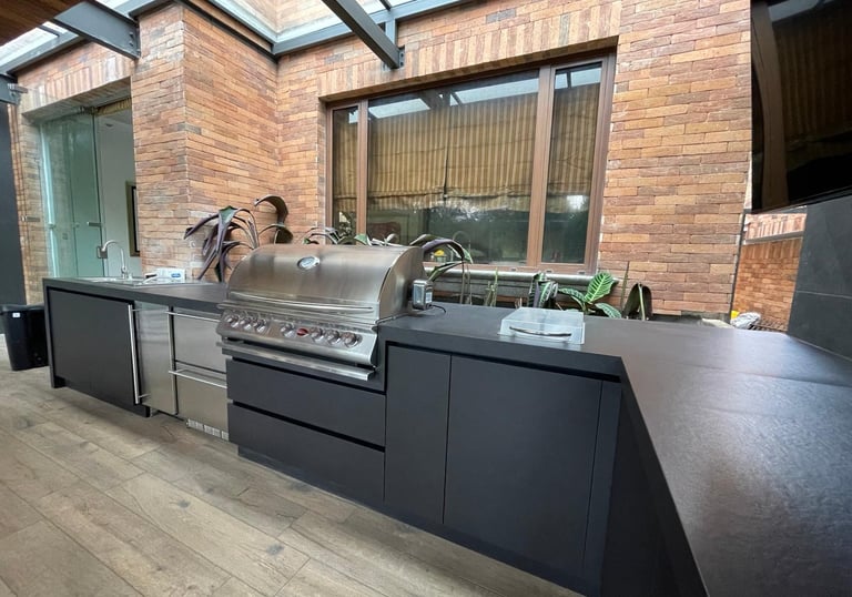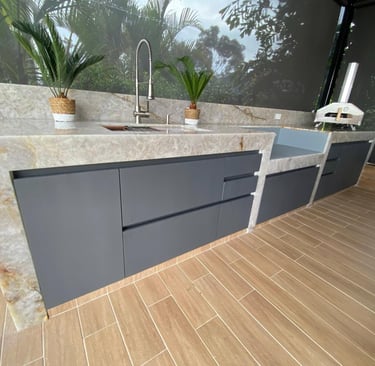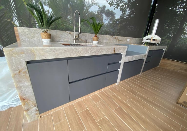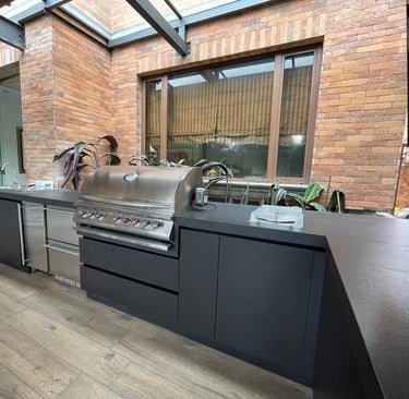 Nuestras cocinas están fabricadas con materiales especialmente diseñados para exteriores, capaces de soportar las exigencias del clima y el uso frecuente. Con bases en melamina hidrófuga, superficies de cuarzo o granito, y componentes en acero inoxidable, garantizamos estructuras que perduran y resisten la humedad y la exposición al sol. Pensadas para quienes disfrutan cocinar en espacios abiertos y buscan calidad y robustez.
